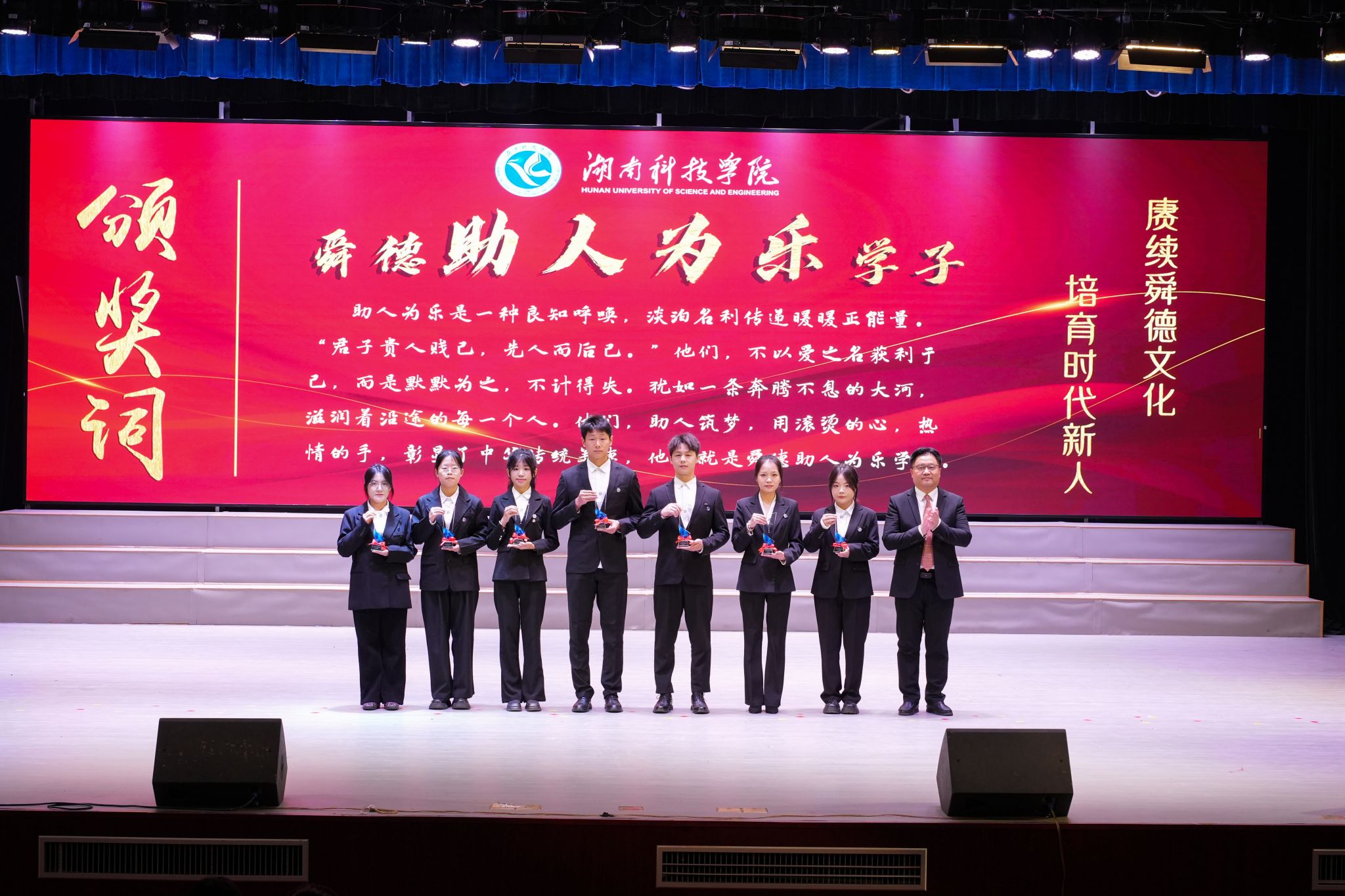 本网讯(记者 谷利梅 彭晥君 摄影 梁自元)舜德千载润青衿,薪火相传启新程。11月24日,我校举行第十六届“舜德学子”颁奖典礼,101名优秀学子获表彰。校党委书记李钢,党委副书记、校长黄创霞等全体在校校领导出席典礼。