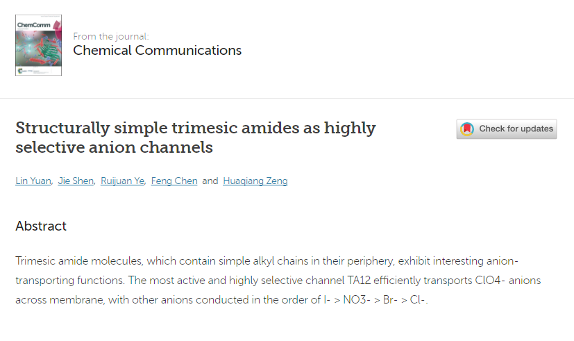 本网讯  近日,化学与生物工程学院袁霖博士以第一作者身份报道了一种结构简单的高选择性阴离子通道,这一成果发表在英国皇家化学会主办的高端SCI学术期刊Chemical Communications(影响因子6.29,中科院分区大类一区)上。