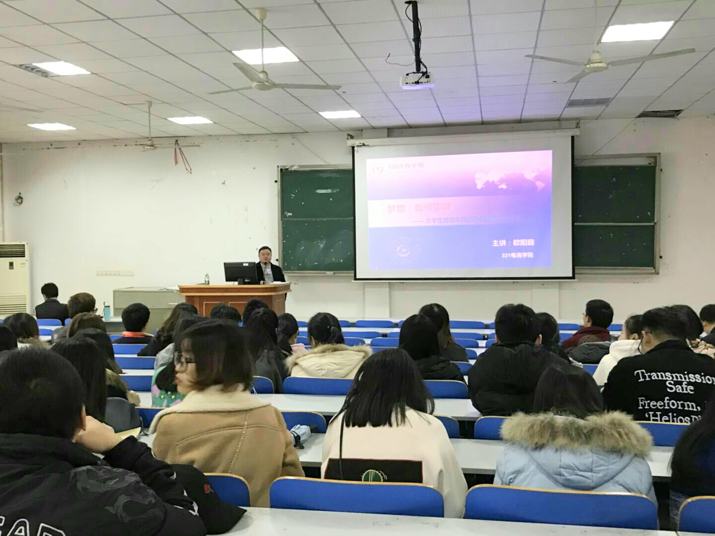 本网讯   11月22日上午,经济与管理学院邀请深圳321电商学院创始人欧阳嶷来校举办“大学生跨境电商创新创业及就业计划”主题讲座,该院院长李清泉、党总支书记胡清华以及2014级全体学生聆听讲座。