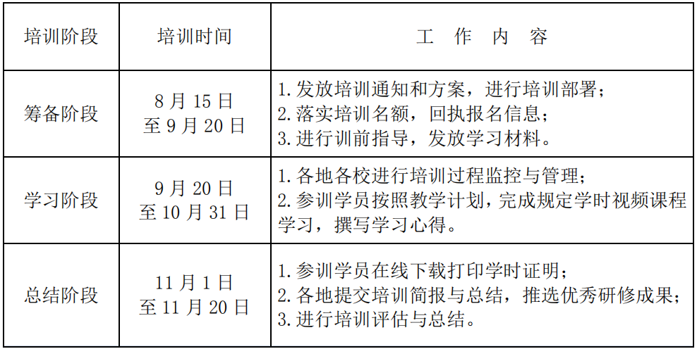 本次培训时间为 2020 年 9 月 20 日至 10 月 31 日,每个阶段的具体时间安排和主要工作内容见下表: